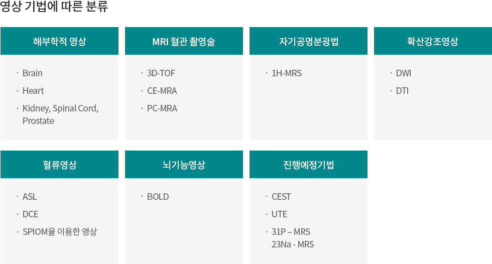 - Dynamic contrast enhanced imaging(DCE-MRI)를 통해서 암부위의 혈류를 영상화하여 암조직의 특성(악성도 및 병변영역 등)을 구분할 수 있습니다.